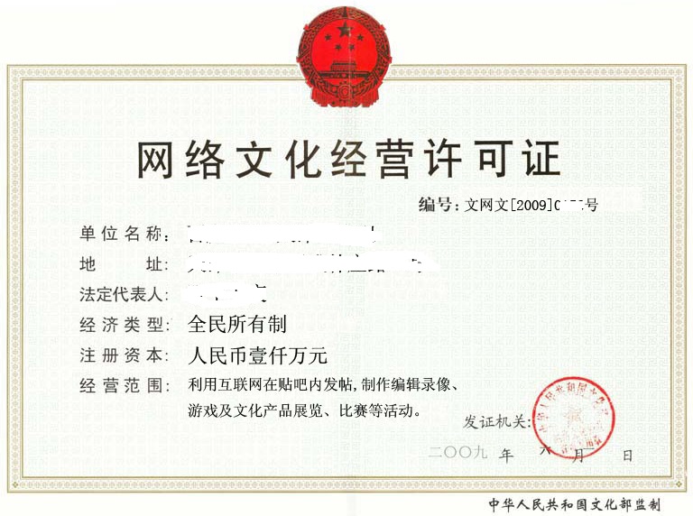 [span]自2010年8月1日,《网络文化经营许可证》审批权已由文化部下放至各省、直辖市、自治区文化厅(局)审批。[1][span]